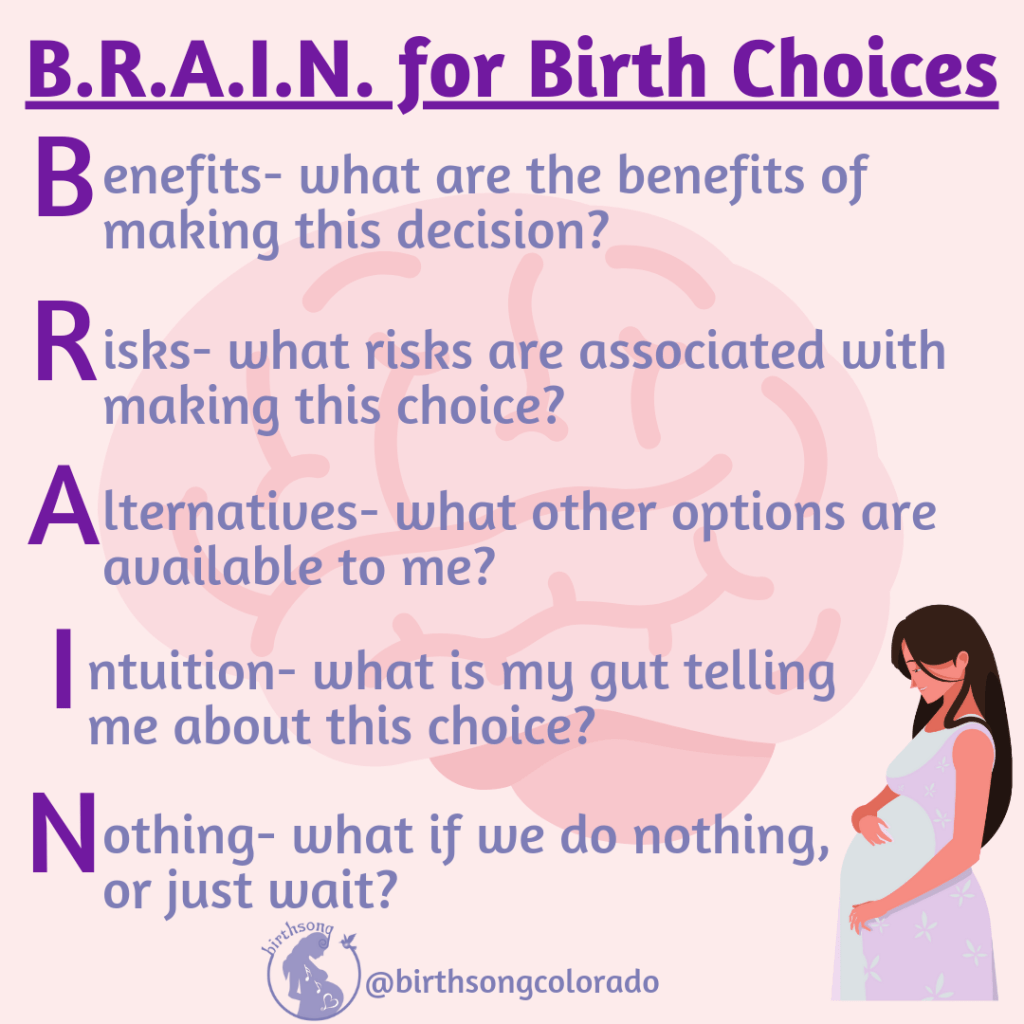 You may or may not have heard of the B.R.A.I.N. acronym. It’s used for decision making, and is an invaluable tool when making important decisions and choices during your labor and birth. Let’s break it down!